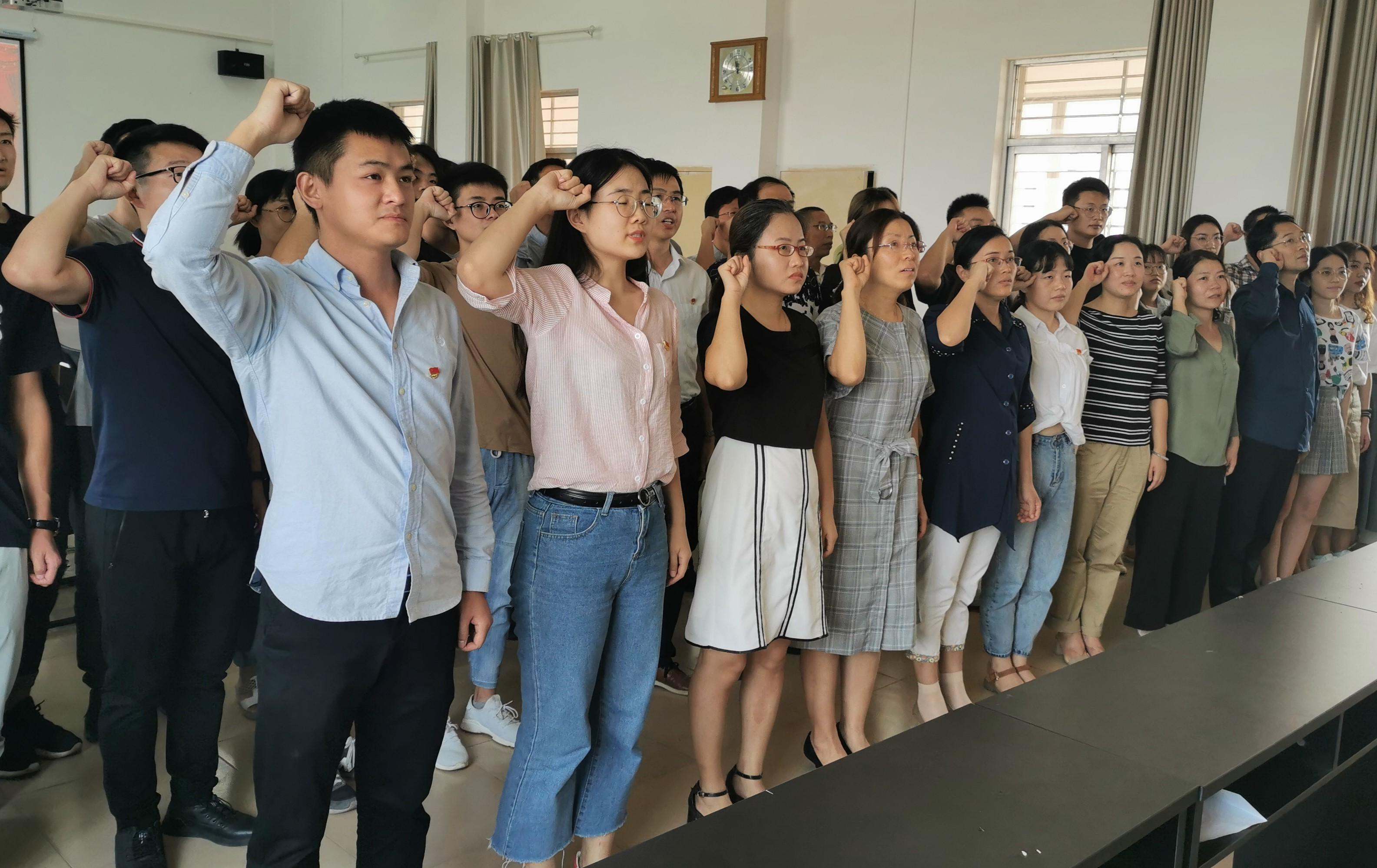 “我志愿加入中国共产党,拥护党的纲领,遵守党的章程,履行党员义务……”,英国365集团网站全体师生党员举起右拳,重温入党誓词,向党旗宣誓,表达忠于党的决心。