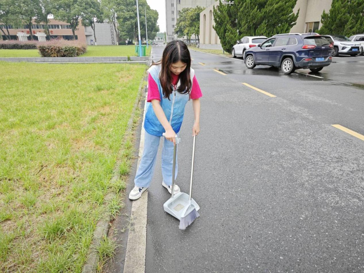 在活动负责人王伊蒙的带领下,志愿者们拿着扫帚、簸箕等工具,仔细地清理街道 、草丛等地。大家充分发扬“不怕苦、不怕累、不怕脏”精神,经过两个多小时的劳作,五号教学楼周边环境焕然一新。
