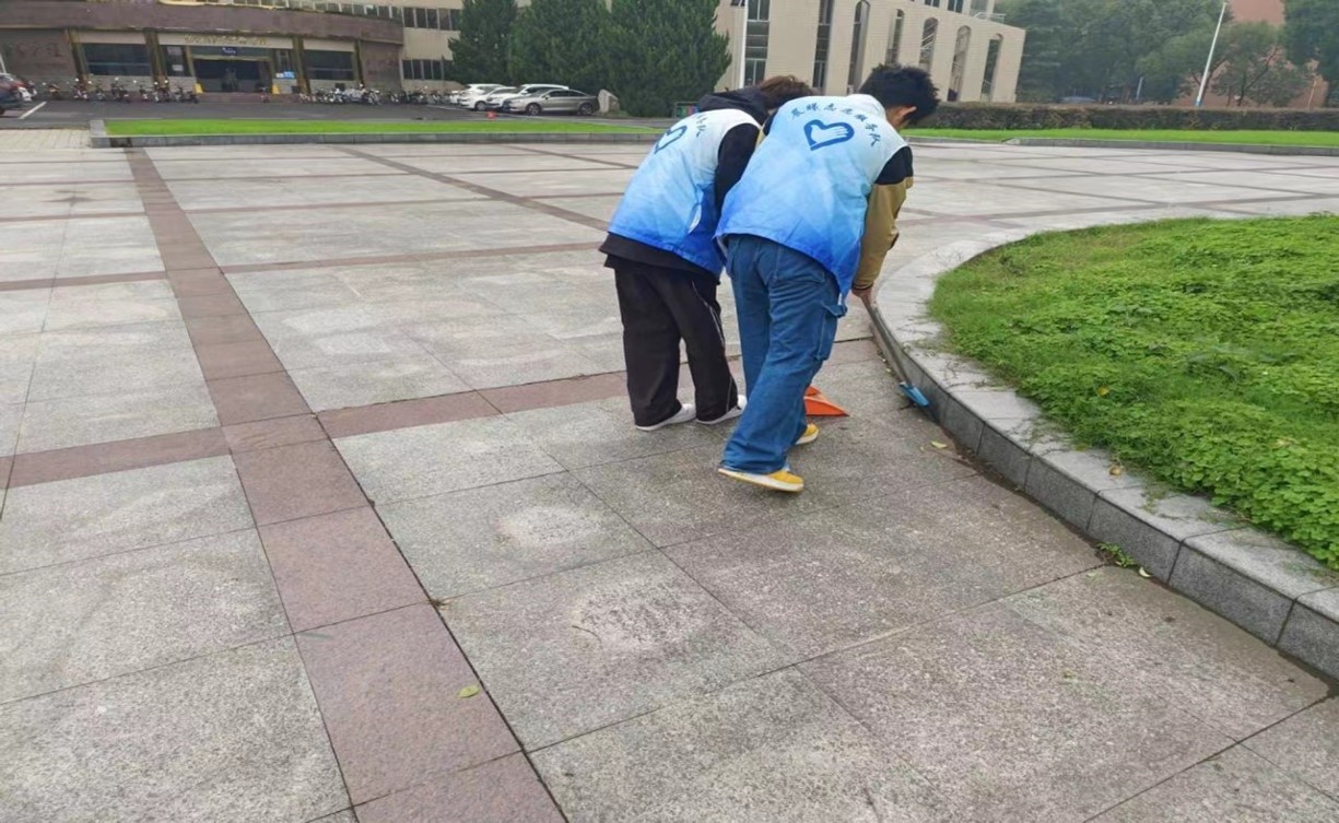 在活动负责人赵冰玉、徐红的带领下,志愿者们拿着扫帚、簸箕等工具,仔细地清理街道、草丛等地。大家充分发扬“不怕苦、不怕累、不怕脏”精神,经过两个多小时的劳作,五号教学楼周边环境焕然一新。