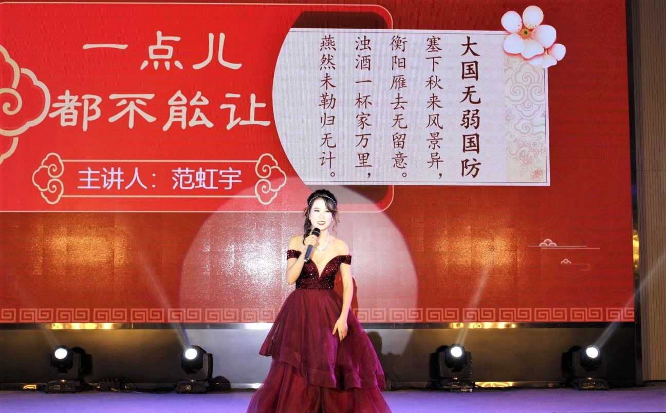 最后,湖北省百生讲坛金牌主讲人范虹宇同学以国防建设为主题的演讲《一点儿都不能让》极大激发了同学们保卫国家安全,献身国防事业的决心与热情,为晚会画上了一个圆满的句号。