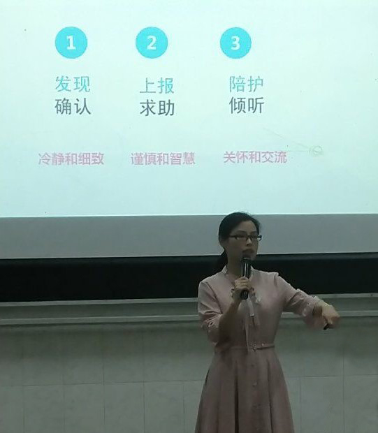 杨湘虹老师从“生命的态度”、“生命之痛”,“守护生命”三个方面向同学们分析了老员工的自杀心理,并着重介绍了抑郁症的相关知识。