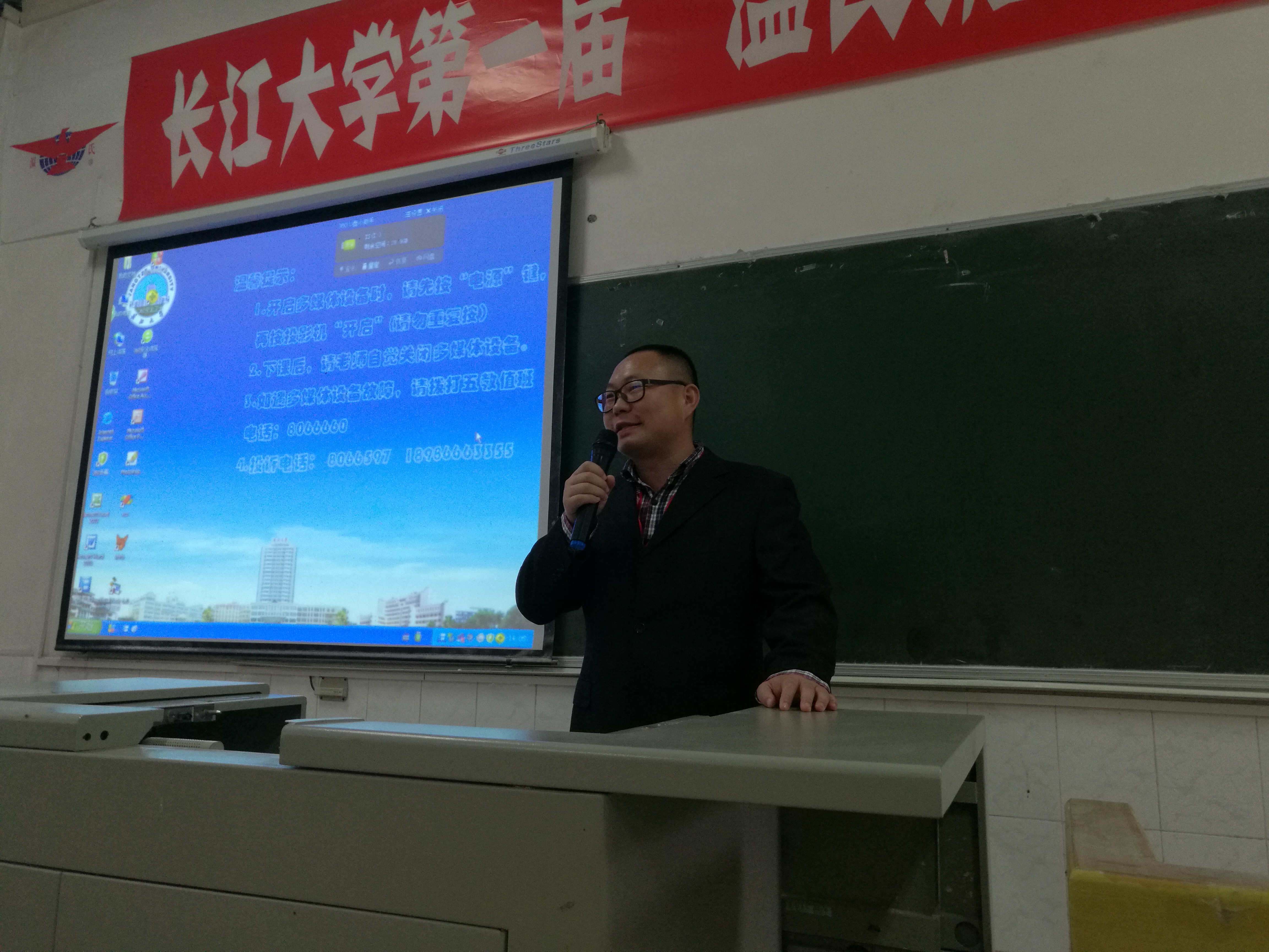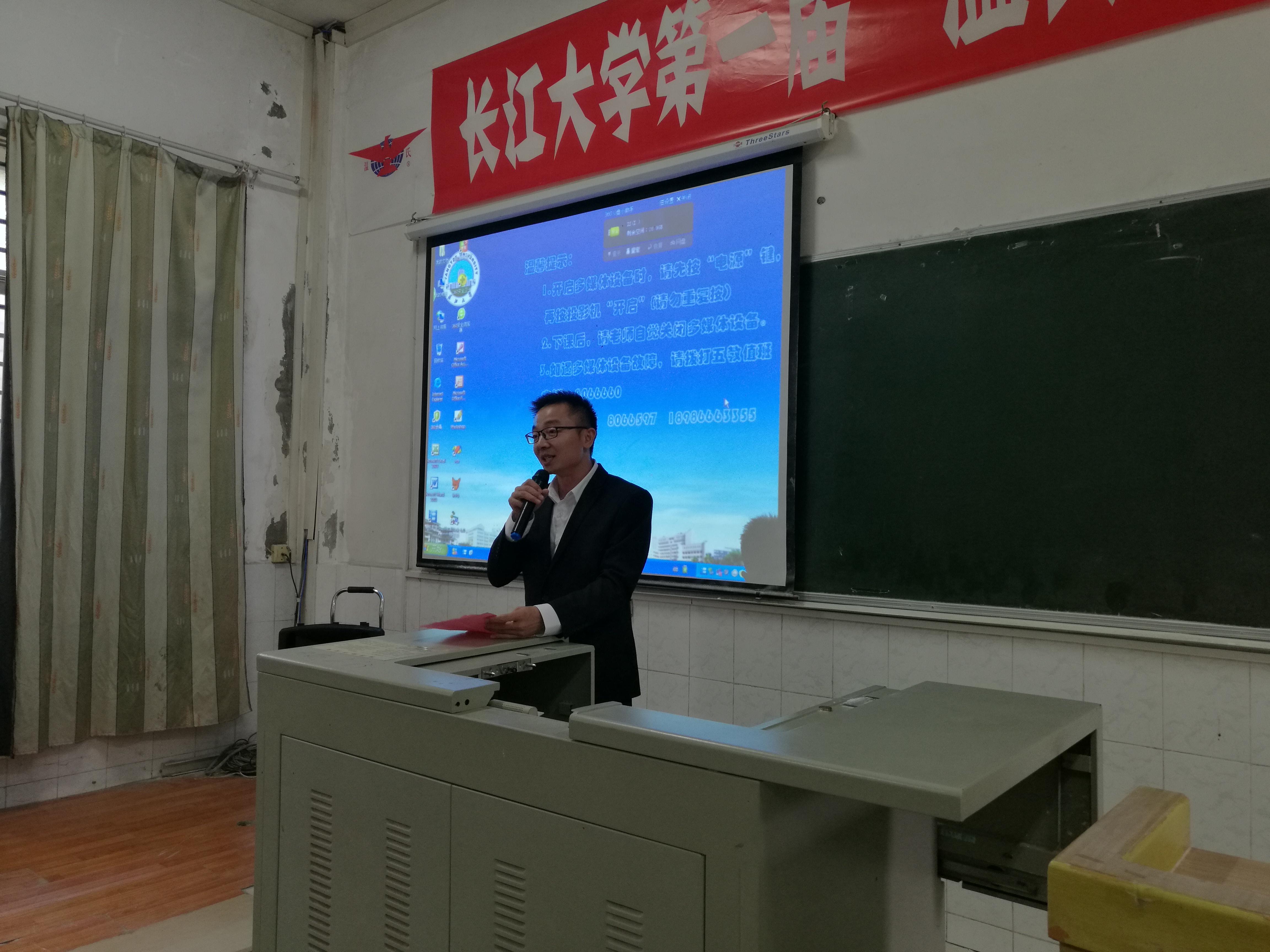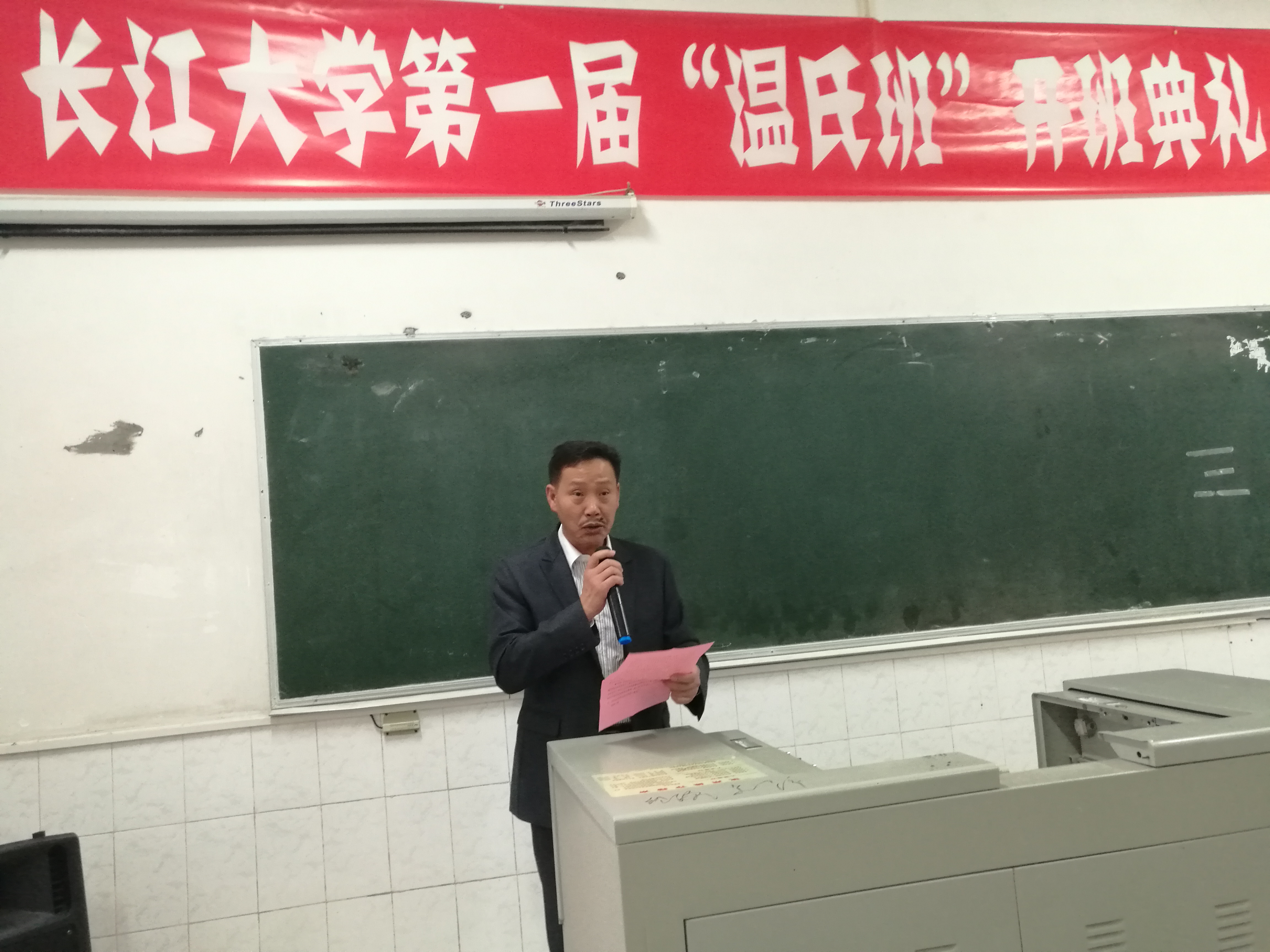 开班典礼前在教室循环播放温氏集团宣传片。典礼伊始,全体成员起立合唱温氏之歌。
