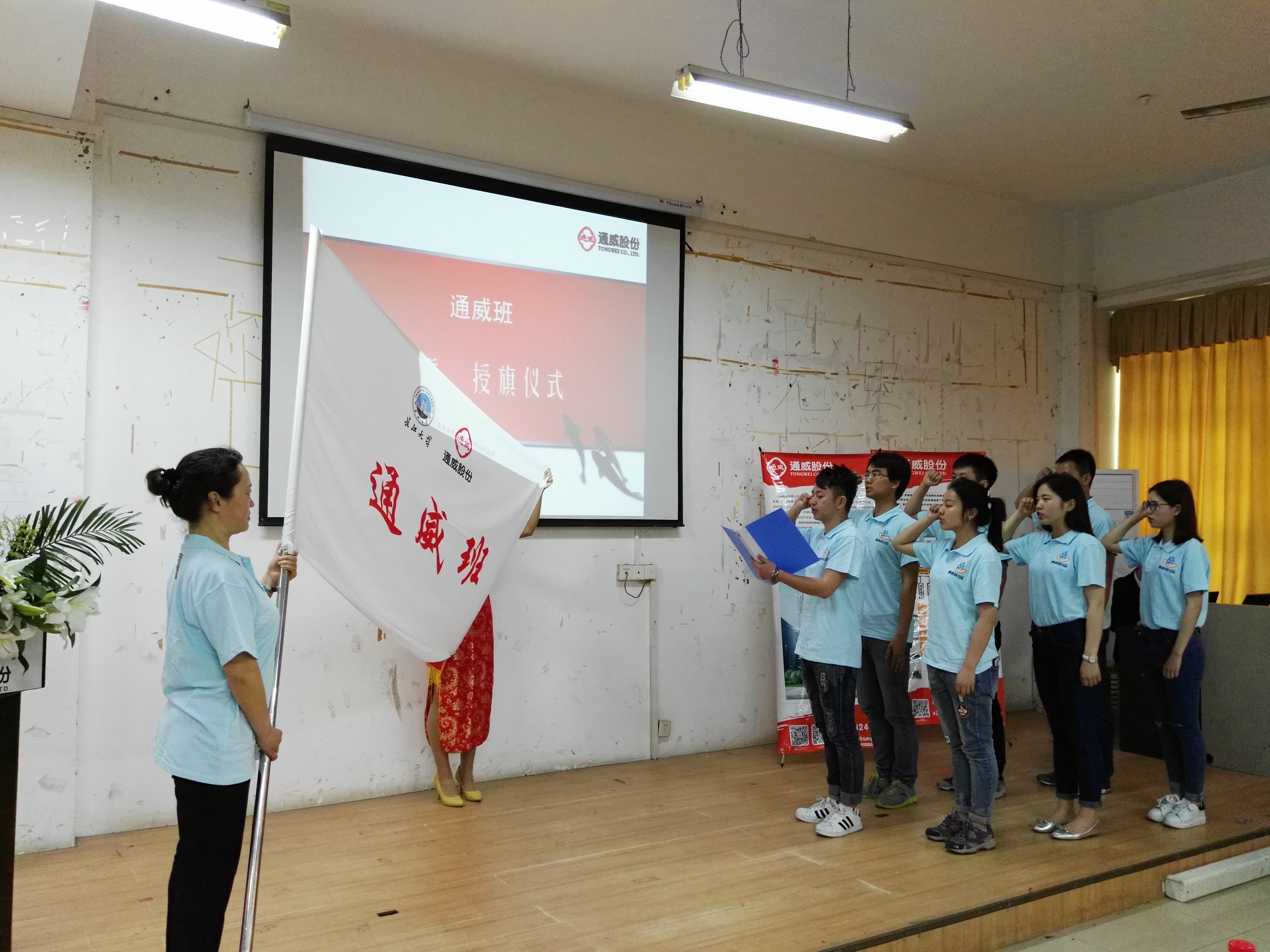 通威股份华中战区人力资源总监毛利红带领同学们在班旗下庄严宣誓并讲话:“万丈高楼平地起,人才战略是企业的第一战略,更是核心武器,将人才培养提前到高校,开启定向辅导,开拓眼见学识,与通威同行,还你不一样的人生”。