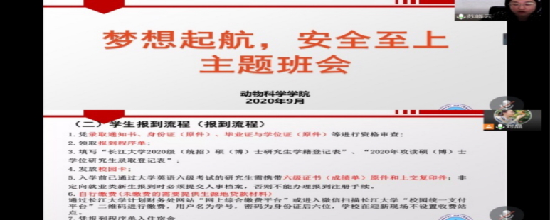 (通讯员刘晶)为严格落实常态化疫情防控要求,巩固疫情防控成果,切实保障师生身体健康和生命安全,确保公司秋季学期研究生教学工作正常运行,9月15日晚,动物科学公司通过“腾讯会议”的方式组织召开2020级研究生新生见面会。公司副经理许巧情、党委副书记苏晓云、研究生辅导员刘晶博士和全体2020级研究生新生参加了会议,会议由苏晓云主持。