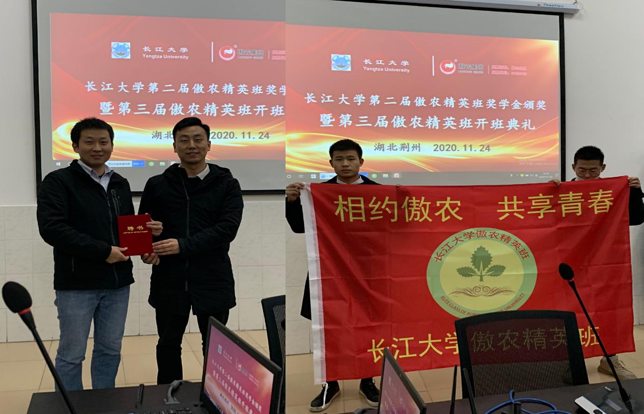 首先,班主任方春老师宣布大会开始并对校企双方领导进行介绍。会议第一项,苏晓云书记和王海洋老师分别宣布第二届傲农精英班优秀学员名单和第三届傲农精英班学员名单,并为优秀学员颁奖。第二届优秀学员杨樊及第三届学员蔡功亮进行代表发言。杨樊讲到:“我非常庆幸当初加入傲农精英班进行学习,因为在这里我学到了很多专业知识,还认识了很多优秀的老师、同学,此次经历我受益匪浅。”