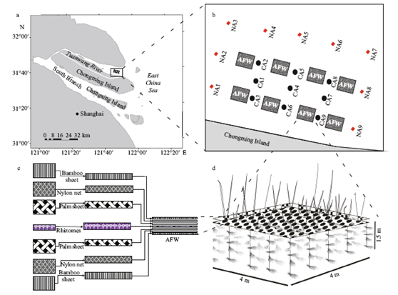 本研究采用无土栽培技术在长江口构建芦苇三维人工漂浮湿地,人工漂浮湿地单元呈“三明治”结构,主要由框架、竹片夹、网片、填料、植物、轮胎和泡沫等7部分组成。轮胎主要是用于减小台风等外界因素所带来的冲击力,每两个浮床之间系一个轮胎,置于两个泡沫之间;而泡沫主要是起到增加浮力作用,置于框架四周。将芦苇人工漂浮湿地放置在长江口生态环境受损水域;通过比较人工漂浮湿地和自然水域的仔稚鱼生物多样性,评判三维人工漂浮湿地是否可以修复仔稚鱼栖息地。