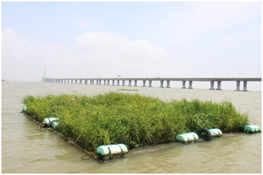 在环境复杂的长江口水域构建三维人工漂浮湿地,人工漂浮湿地通过改变水域环境达到修复和保护仔稚鱼栖息地的目的。