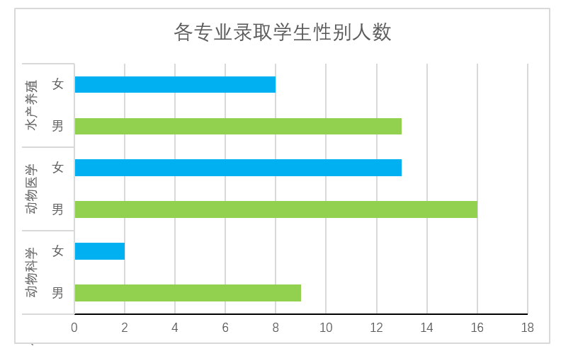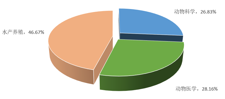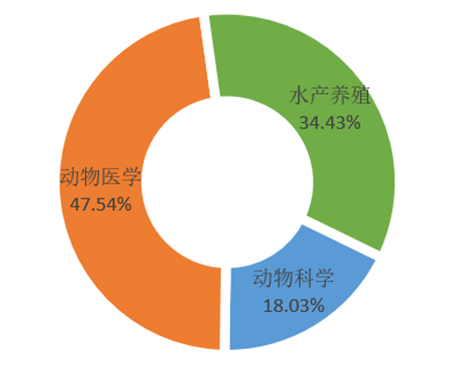 从录取员工专业分布来看,动物科学专业占18.03%,水产养殖专业占34.43%,动物医学专业占47.54%。