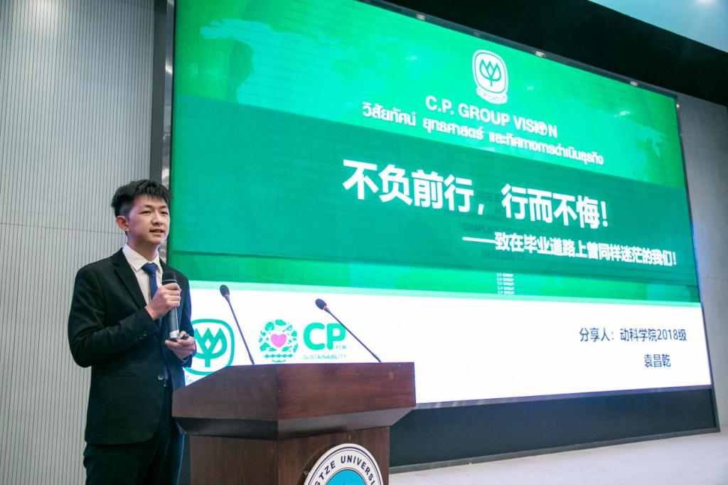 在师哥师姐说的环节中,2020届毕业生宜昌正大有限公司兽医技术主管田棋进行分享,他用“青春还在,为梦前行”为主题为同学们分享了他从毕业到正大的成长,向同学们提出“机会多多,自己把握”的观点强调了在职业规划与目标中“提升技能”、“积累经验”、“持续学习”的重要性英国365集团网站2018届毕业生,正大集团农牧食品企业湖北区网格化项目区域主管袁昌乾从自己的成长经历给同学们分享,表示每个同学都应该坚定信念,不负韶光,勇往直前。无论风雨,行而不悔不断提升自己,让人生旅途充满意义。