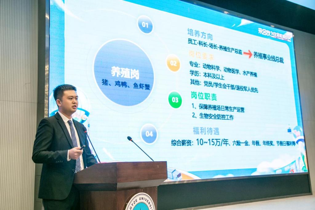 在岗位发布环节中,正大集团农牧食品企业湖北区养殖事业人力资源总监陈俊卓详细介绍了2024-2025年度正大集团招聘岗位需求及招聘数量,并从人才培养理念、各岗位工作特点出发,介绍了公司的培养模式和人才发展路径,为公司学子提供了非常多的优质岗位,希望同学们积极报名投递简历,长大了上长大,毕业了到正大。