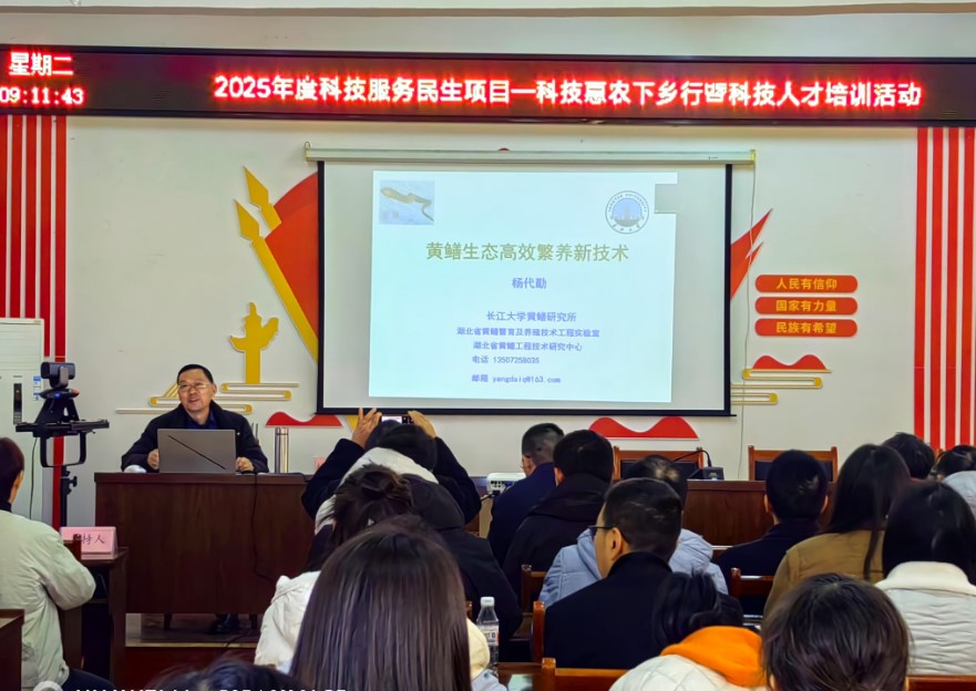 公司英国365集团网站特色水产健康养殖团队负责人农业农村部行业专项首席科学家、博士生导师杨代勤教授作为特邀嘉宾作首场报告。杨代勤教授结合最新的研究成果和产业发展现状,从稻虾鳝生态综合种养技术、黄鳝苗种人工仿生态繁育技术和黄鳝温室微流水高效养殖技术等方面介绍了黄鳝生态高效繁养新技术,黄鳝新的养殖模式和新技术以及产业发展带来的新机遇引起了大家的浓厚兴趣,受到线上线下参训人员密切关注和高度认可。