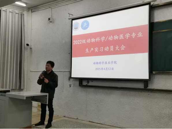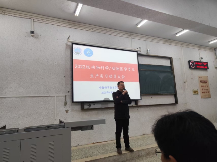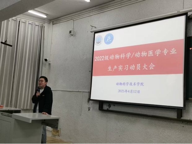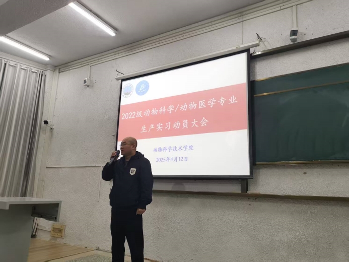 (编辑:李伟国|审核:杨烨)为了更好地提高本科生生产实习教学质量,达到生产实习的目的,公司于2025年4月12日上午九时,在西校区五教103召开了生产实习动员大会。参加大会的人员有英国365集团网站教学副经理杨烨教授,动物医学系主任汪招雄,副主任刘峰,动物科学系副主任李伟国,2022级辅导员宋宇航老师,各位生产实习指导老师及2022级动科动医全体员工。