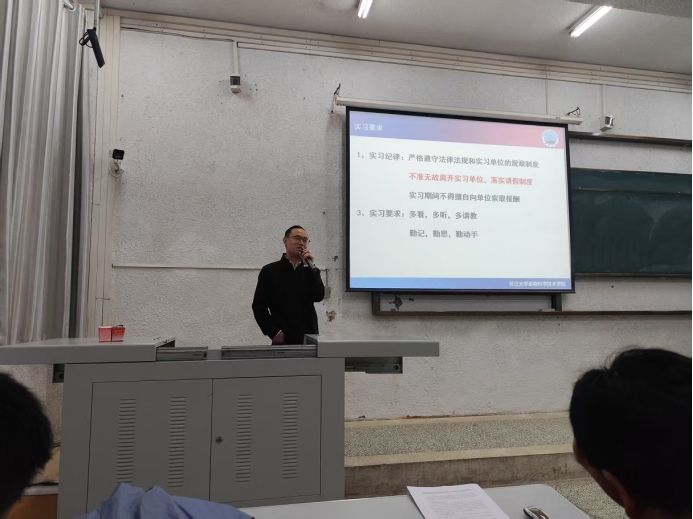 首先,动科系李伟国老师对生产实习进行了一个整体的介绍,包括实习目的、实习时间、实习单位及人数、实习纪律及要求和成绩考核等。此番发言解决了同学们的疑惑,并知道了实习前应做如何准备。