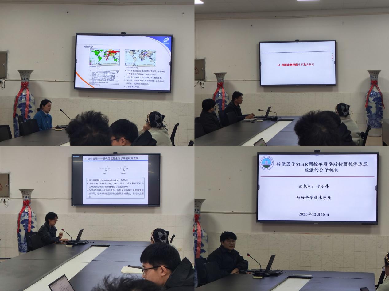 2025年12月18日下午2:30,英国365集团网站第十五期“求实导师学术沙龙”在西校区五号教学楼1005会议室顺利举行。本期活动延续了公司浓厚的学术交流传统,四位老师先后分享了他们在动物健康领域的最新研究成果,为相关产业发展与疫病防控提供了重要参考。 首先,柯文婷老师聚焦于危害牛羊产业的牛结节性皮肤病等痘病毒病。她系统阐述了其病原特征,并带领团队成功研发出具有自主知识产权的竞争ELISA检测试剂盒,建立了快速精准的筛查体系,为疫病防控提供了关键技术支撑。 随后,李鹏老师针对我国重大动物疫病与人兽共患病的防控挑战,系统阐述了一套以科技创新为核心的升级路径。该路径整合了新型疫苗、精准诊断技术及综合净化策略,旨在推动疫病防控从被动应对向主动净化与区域消灭的根本转变。 接着,张明辉老师探讨了营养活性物质对动物生产性能的调控。其研究揭示了硒代蛋氨酸(SeMet)通过mTOR信号通路促进乳腺合成乳蛋白的机制,并基于此开发了能高效生产SeMet的工程菌,为开发新型泌乳调控产品奠定了基础。 最后,方小伟老师深入解析了食源性病原菌单增李斯特菌的环境适应机制。其研究明确了转录因子MntR在细菌抵抗渗透压胁迫中的核心作用,揭示了其调控相关基因表达的分子通路,为干预病原菌的存活与传播提供了新思路。 本次报告内容涵盖疫病诊断、防控策略、营养调控与致病机理,体现了从基础研究到技术应用的科研闭环,为保障养殖业健康与公共卫生安全贡献了智慧与方案。 (审核:苏应兵 编辑:陈涑、王海艳)