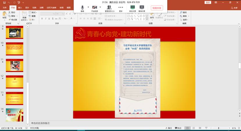 首先,由王春阳同学表明本次班团会的目的及流程,并主持本次班会讲解。会议讲解了《习近平回信勉励北京大学援鄂医疗队全体“90后”党员》的重要精神,肯定了中国人民为抗击疫情做出的重大奉献,表扬了青年团体正成为国家的中流砥柱。