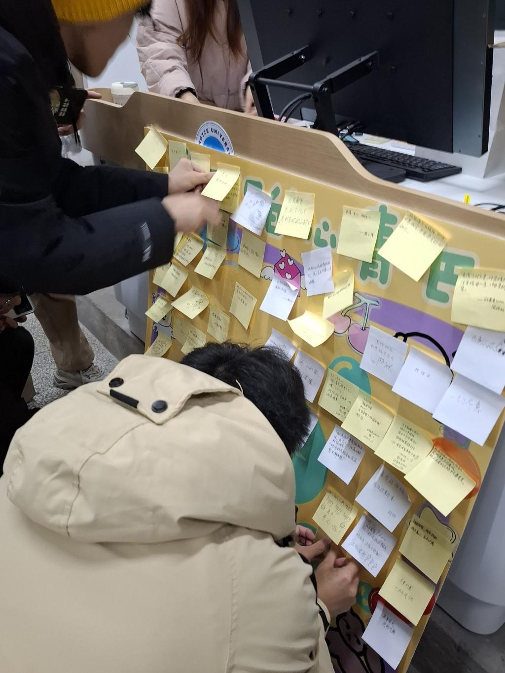 随着活动的展开,同学们踊跃参与,纷纷用这些贴纸记录下自己的想法和感受,随后将写好的便签贴在展板上,原本单调的展板上逐渐被便签填满。