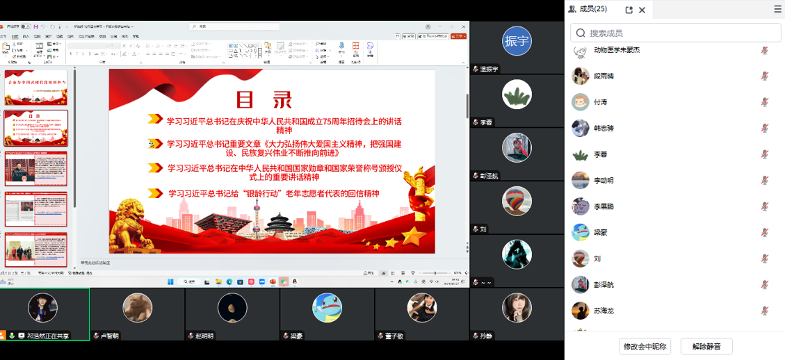 为深入学习贯彻习近平总书记近期重要讲话指示精神,进一步推动教育强国建设,弘扬教育精神,培养高素质人才,深入贯彻落实全国教育大会精神,激发研究生的学习热情和创新意识,动物科学技术院研究生于2024年10月18日-10月30日在各班举行了10月政治理论学习活动,本次会议以班级班会组织学习、讨论为主,利用员工业余时间自学等形式为辅,线上、线下学习相结合,使理论学习取得良好的效果,加深对教育事业发展的认识,同时为研究生提供一个交流学习的平台。会议由各专业班级负责人主持,回顾了全国教育大会的主要内容和精神,强调了教育在国家发展中的重要性。会议中,还邀请了几位优秀的同学代表分享他们对教育改革的看法和个人的学习心得。在互动环节,同学们积极发言,讨论了当前教育领域面临的挑战与机遇。大家一致认为,作为新时代的研究生,应当肩负起推动教育改革和发展的责任,努力提升自身的学术素养和实践能力。 本次政治理论学习主要内容如下: 习近平在全国教育大会上强调,紧紧围绕立德树人根本任务,朝着建成教育强国战略目标扎实迈进。 习近平在全国民族团结进步表彰大会上发表重要讲话强调,推进中华民族共同体建设,巩固发展中华民族大团结。 中华人民共和国国家勋章和国家荣誉称号颁授仪式在京隆重举行,习近平向国家勋章和国家荣誉称号获得者颁授勋章奖章并发表重要讲话。 庆祝中华人民共和国成立75周年招待会在京隆重举行习近平发表重要讲话。 《求是》杂志发表习近平总书记重要文章《大力弘扬伟大爱国主义精神,把强国建设、民族复兴伟业不断推向前进。 《求是》杂志发表习近平总书记重要文章在党的二十届三中全会第二次全体会议上的讲话。 本次政治理论学习圆满结束。同学们积极参与学习,分享了各自的学习心得,促进了政治理论思想与实践上的结合,本次学习引导同学们深刻理解个人命运与国家发展的紧密联系,强调青年员工的使命与责任,不忘初心,为实现中华民族伟大复兴的中国梦而不懈努力,回顾历史、展望未来,如何更好支撑和服务中国式现代化,增强了开放包容、互联互通、共同发展的意识,进一步树立清风正气,严守政治纪律,共同推动构建人类命运共同体。 (审核:王婷|编辑:董子敬 史博敏)