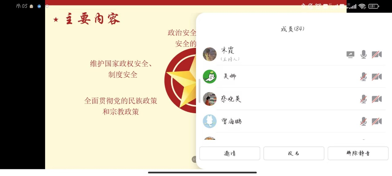 其次,主讲人还介绍了总体国家安全观宣传教育活动。她强调政治安全是国家安全的根本,维护国家政权安全、制度安全是重要任务。与此同时,她还提到了全面贯彻党的民族政策和宗教政策,以及防范化解党的建设面临的风险。