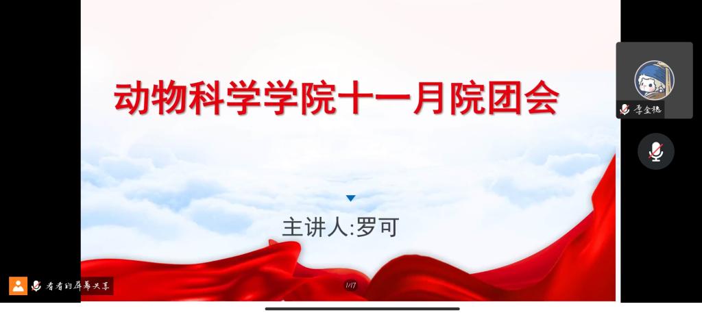 (通讯员:李金穗 胡贤灵)为深入学习贯彻党的二十大精神,庆祝建团100周年,着力提升团的引领力、组织力、服务力以及大局贡献度,全面深化改革,全面从严治团,不断保持和增强政治性、先进性、群众性。动物科学公司于2022年11月18日19时,在腾讯会议召开了以“学习二十大,启航新征程”为主题的十一月院团会活动,参加本次活动的人员有动物科学公司全体员工会成员及各班班委。本次活动主讲人为团学部成员罗可。