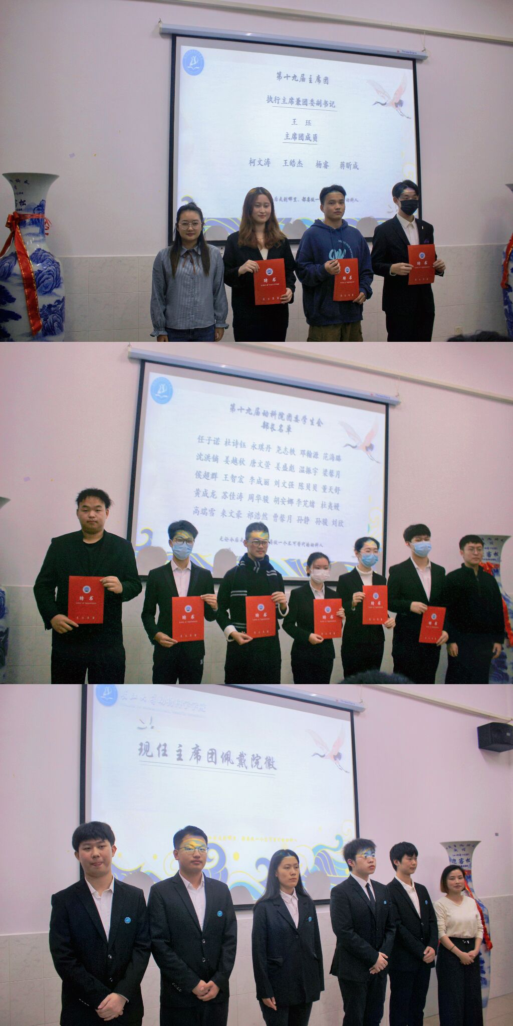 第二项是颁奖环节,公司杨湘虹老师颁发了第十九届主席团成员和部长级聘书以及为现任主席团成员佩戴徽章,并拍照留念。