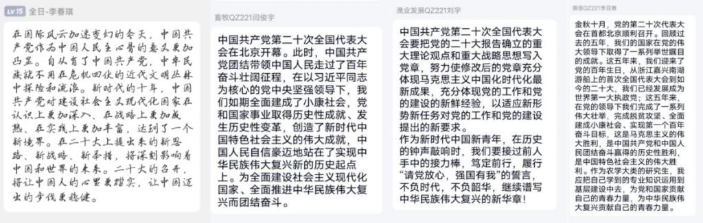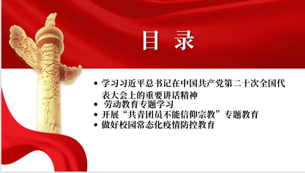 10月16日,团支部组织全体同学在腾讯会议观看二十大的直播并撰写观后感。团会第一项,由李金穗同学带领大家学习习近平总书记在中国共产党第二十次全国代表大会上的重要讲话精神,包括伟大建党精神、斗争精神、钉钉子精神、劳动精神、奋斗精神、奉献精神、创造精神等;第二项,开展劳动教育专题学习;第三项,开展“共青团员不能信仰宗教”专题教育。