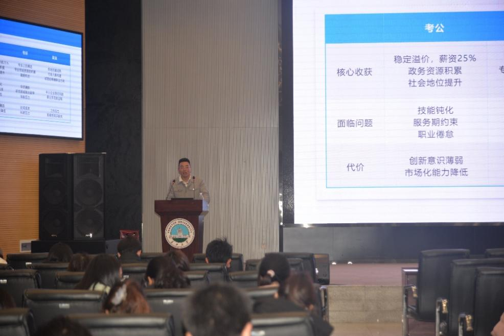 讲座伊始,黄浩从考研、考公、就业的背景、收益和风险入手,详细分析了不同选择对未来三到五年发展的影响。他结合自身经历,深入浅出地讲解了如何根据个人兴趣与职业规划做出最优选择,并强调“选择没有对错,关键在于是否适合自己”。