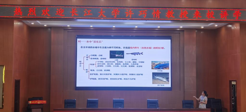 报告会上,许教授从鲟的种类、鲟类保护、鲟产业等三个方面给员工上了一堂生动的、内涵丰富的科普课。许教授强调说:中华鲟是中国一级重点保护野生动物,是活化石,有“水中大熊猫”之称,但受人类活动影响,长江水生生物资源急剧下降,部分珍稀濒危物种的野外种群数濒临灭绝,保护水生生物迫在眉睫。许巧情详细介绍了“十年禁渔”等各项具体保护措施,鲟产业的介绍让员工大开眼界,大大激发了员工攀登科学高峰的兴趣和热情,是一次很好的生涯规划教育。报告会上,许教授还回答了部分员工提出的一些问题,黄梅一中正高级生物教师黄胜老师对许教授的报告进行了精准的点评。