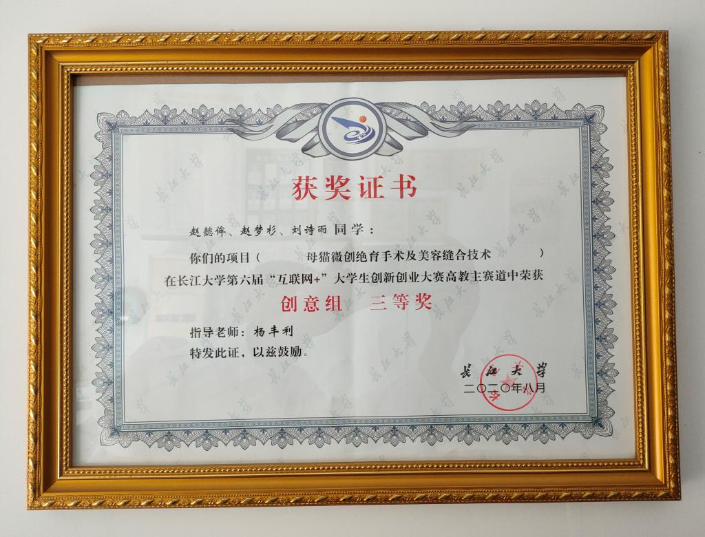 该成果于2017年始申请并立项英国365集团网站老员工创新创业项目,经过三年的研究讨论、查阅资料、无数次的实践,在2020年8月获得英国365集团网站创意组三等奖。经过2020年和2021年两年期间将犬猫绝育手术切口由常规的4CM以上缩减至0.6CM,美容缝合技术经3次改良,最终形成杨氏缝合法。命名为杨氏缝合法是借鉴《兽医外科手术学》中缝合方法的名称,如伦勃特氏缝合法、库兴式缝合法、康乃尔氏缝合法等。