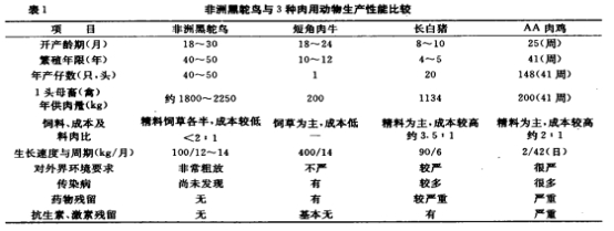 非洲黑鸵鸟全身是宝 , 具有很高的经济价值。 鸵鸟肉质鲜美, 瘦肉特多 , 蛋白质含量高 , 而胆固醇含量低;皮的质地致密, 可制成高级皮革, 羽毛可做服装业或工业的上等原料。 与主要肉食动物的生产性能比较, 非洲黑鸵鸟的经济价值是其它畜牧养殖业无法相比的( 表 1 ) 。