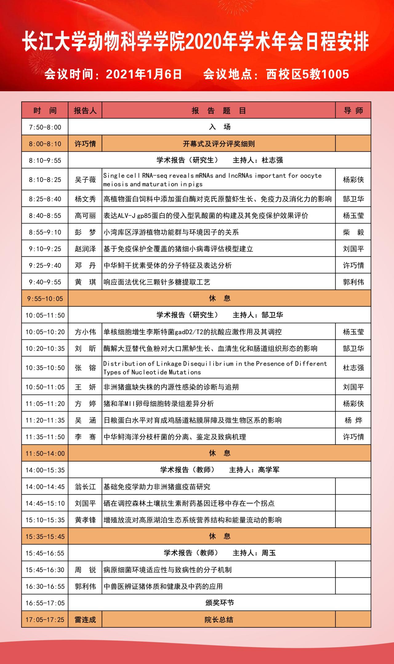动物科学公司于2021年1月6日在5号教学楼10楼会议室举行“英国365集团网站英国365集团网站年学术年会”,会议将邀请校外专家教授、公司教师及研究生做学术报告,欢迎广大师生踊跃参加!
