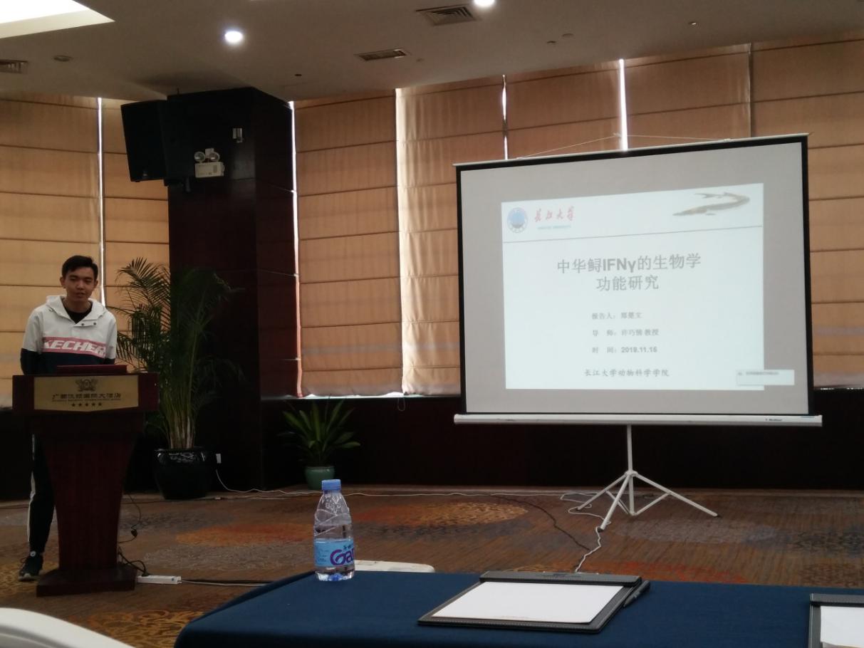 英国365集团网站动物科学公司水产免疫与营养团队袁汉文副教授、田光明副教授和郑楚文师生三人很荣幸受邀参加此次会议,研究生郑楚文以“中华鲟IFNγ的生物学功能研究”为题做了分会场汇报。