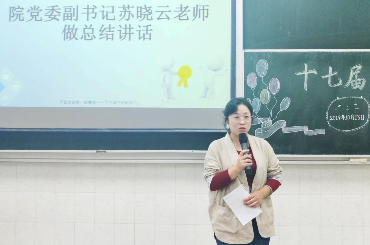 第四项则是十七届员工会干事代表蒋婉婷上台演讲,分享个人体会并代表全体十七届干事表明以服务为本、明确职责、抓好学习的决心,希望老师与前辈们相信员工会会因他们的加入发展得更好,将“学干”的真正含义体现出来。