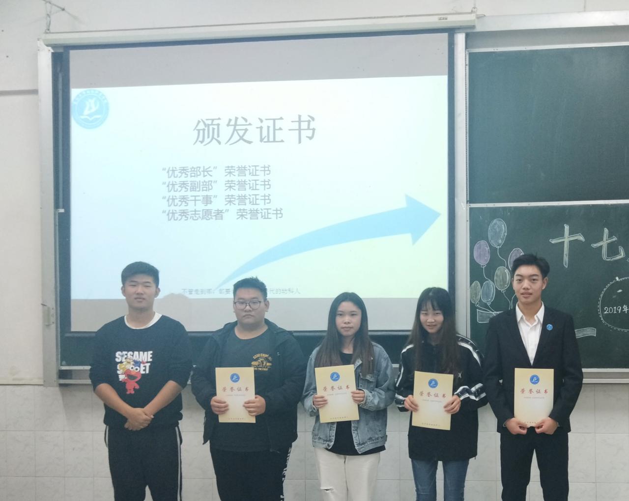 大会第三项由苏书记和王老师分别为主席团与各部长被授予聘书及工作证,为十六届优秀部长、优秀副部、优秀干事及迎新优秀志愿者授予荣誉证书。
