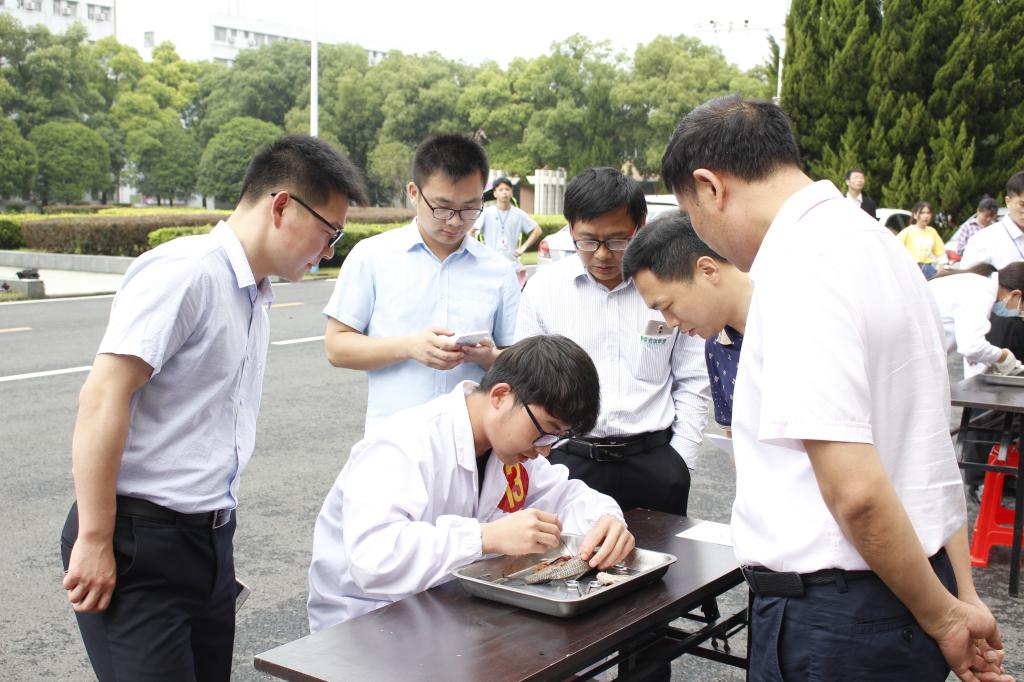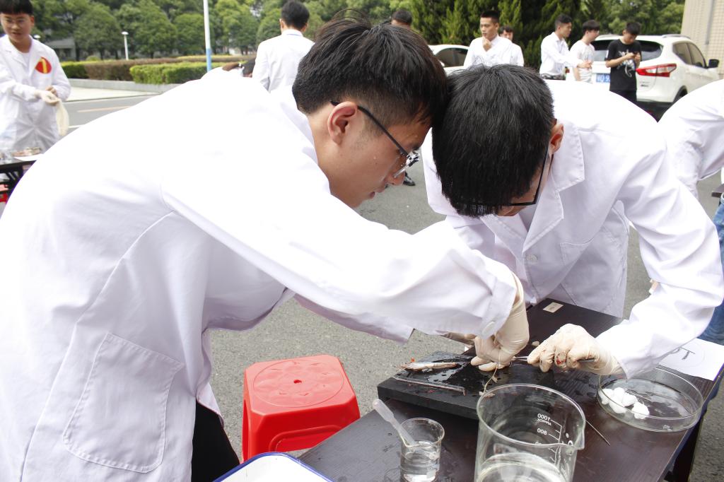 首先由严子星宣读HSE健康、安全、环保文件,然后王经理发言预祝此次比赛成功。在曾庆军老师的开讲词中提出了三点意见。参赛选手代表张应胡带领宣誓下比赛进入正题,首先是非专业组进行鲫鱼的解剖实验,虽然名为非专业组,但操作是十分专业的,短短几分钟就很快有人完成了解剖,面对评委老师的提问他们也毫不胆怯,对答如流。中场休息时,我们有幸听到了笛箫协会为我们带来的美妙笛音。然后是专业组的比拼,分别是水产组和动医组,水产组的实验是解剖小龙虾和鲫鱼,动医组的实验为取牛蛙腓肠肌标本和家兔的解剖。一顿操作猛如虎,选手们的操作非常熟练,竞争十分激烈,太阳的暴晒下,很多同学的头上都冒了汗珠,但是都在规定时间内完成了比赛。面对老师的提问他们也表现出了他们的专业性。实验结束后,选手们的心情终于得到了放松。罗鸣钟老师对实验过程进行点评,他表扬了其中好的操作同时提出了还可以更好的希望。然后由李鹏经理进行总结,表达了解剖大赛要继续传承下去的美好愿望。