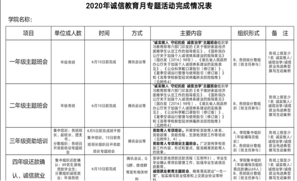 活动以“诚信教育”为主题,一、二年级通过腾讯会议开展“诚实做人、守纪抗疫、诚信治学”主题班会,以演讲、ppt讲解等多种形式组织学习教育部等六部门印发的《国务院办公厅关于加强个人诚信体系建设的指导意见》、《高等公司新型冠状病毒肺炎防控指南》等相关文件,引导员工在学习生活中宣扬诚信、践行诚信。三年级开展资助育人专项培训,通过腾讯会议和qq群学习了解了资助育人体系、资助政策和流程、生源地贷款的相关政策。