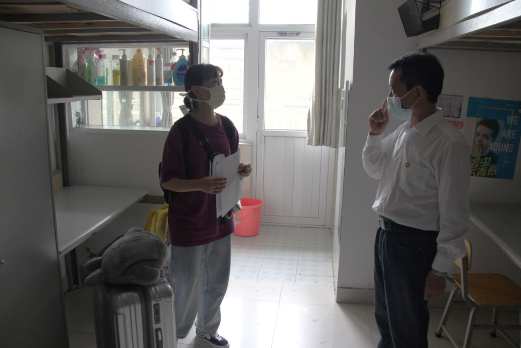 “我来的时候宿舍是干干净净的,我走的时候也要把宿舍打扫得干干净净。”在听到朱书记称赞自己把宿舍打扫地很干净时,动科医职31601班的郑姝同学如是说。“好的品质难能可贵,要把它带到今后的学习和工作中。”朱书记寄语道。