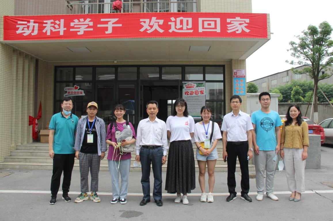 在宿舍楼下,朱业宏还欣然与返校的毕业生和志愿者合影留念。