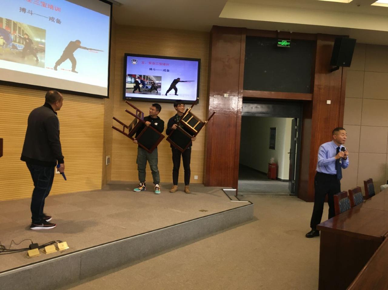 报告会伊始,徐警官通过轻松的开场,向同学们传达了抖音防身术是不可信,寻求安全最佳的方式要从意欲开始洞察并远离危险。随后,徐警官向同学们明确了安全的词典定义、国家定义、联合国定义,分析了意欲与意志的区别,通过一系列动作示范、与同学们的友好互动,强调意欲对于规避危险的重要性。