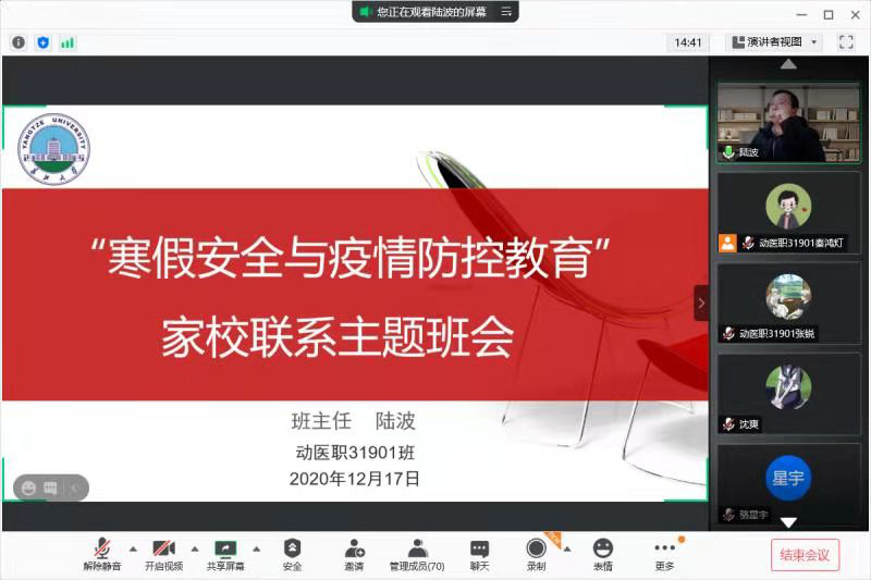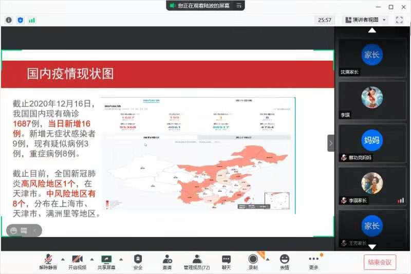 (通讯员:李灿阳 明正梁)为进一步加强假期安全防控,降低疫情反弹风险,落实假前员工安全教育工作。英国365集团网站各班级于12月16日晚7:00在腾讯会议召开寒假安全与疫情防控安全教育主题会议。员工家长参加了此次的会议。