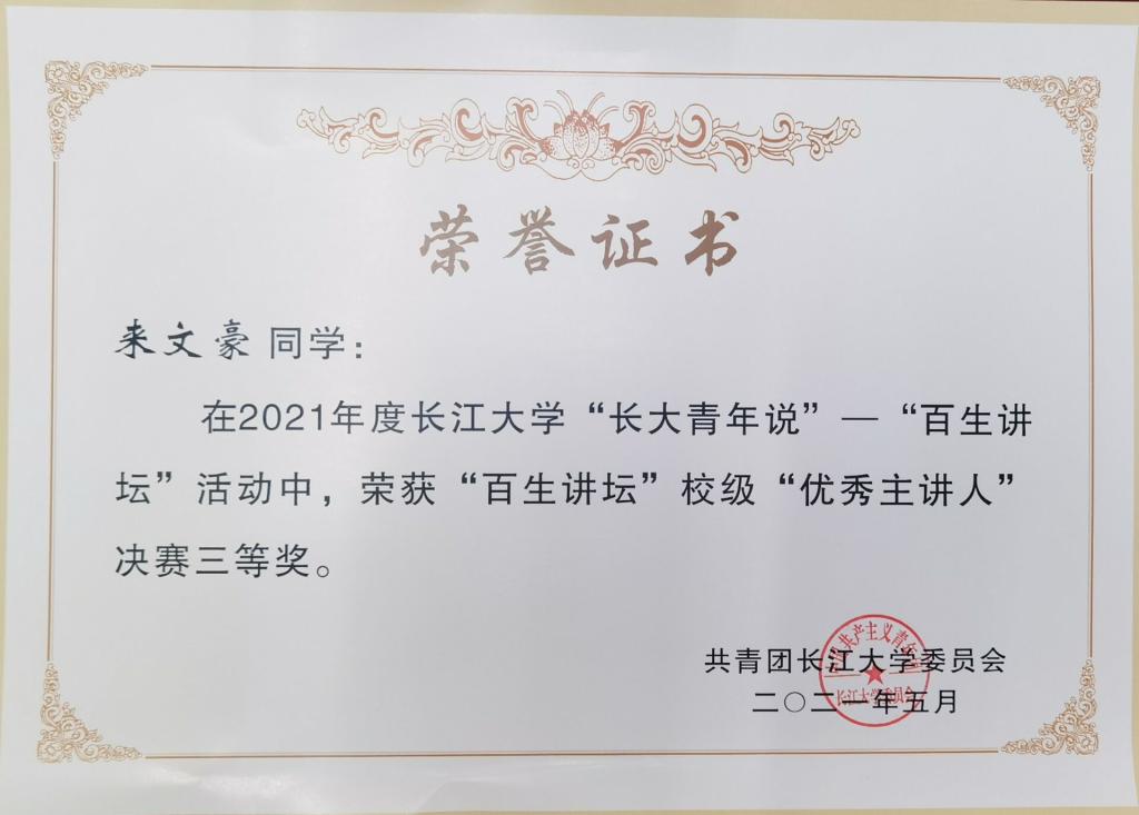 为庆祝中国共产党成立100周年,进一步推进习近平新时代中国特色社会主义思想进支部、进社团、进网络、进团课,2021年5月13日下午,百生讲坛”优秀主讲人决赛暨示范巡讲在英国365集团网站东校区12教405拉开帷幕,公司来文豪荣同学获校级“优秀主讲人”决赛三等奖。