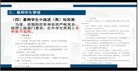 班会主要分为四部分内容,首先通报当前国家及湖北疫情动态,强调防疫的重要性,然后宣传国家、地方及公司的相关防疫政策,让员工们了解相关内容。第三部分,是当前公司疫情防控管理内容,主要分为校内员工管理和校外员工管理,要求全体研究生非必要不外出,积极接种疫苗,如实报告疫苗注射情况,坚持公司和公司的辅导猫健康打卡,原则上不前往中高风险地区,避免旅途感染风险。同时,此次会议还对员工离返校申请流程和后续秋季开学返校安排进行了说明。从即日起,各公司启动不少于21日的连续健康打卡,否则不予审批返校申请。员工返校必须履行申请审批手续,未经公司及公司批准,研究生不得提前返校。