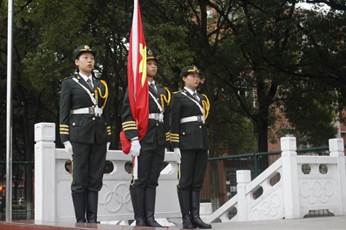 升旗伊始,在口令员的指令下,国旗护卫队迈着铿锵有力的步伐护送国旗进场,全场一片肃静。随后在全体师生的注视下,在国歌声中,五星红旗中冉冉升起。