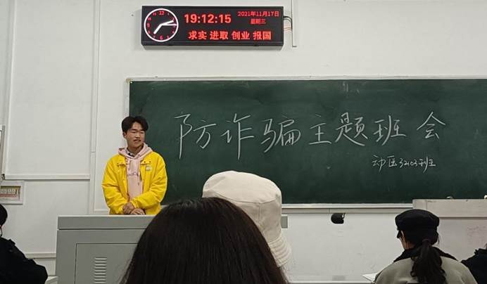 (通讯员:杨湘虹 凤昊)科技发展的日新月异,信息网络普及我们的生活,但这也让很多不法分子趁虚而入,侵蚀网络空间。他们利用电话、QQ 、微信号、邮箱等作案手段不断翻新。为提高同学们的防范意识,保障财产安全,公司于2021年11月17日在晚自习期间组织大一同学以班级为单位举办防诈骗主题班会、动医32101班班主任张佳兰、21级辅导员杨湘虹,兼职辅导员严子星参加了本次班会。