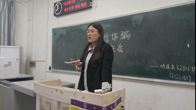 本次班会采取班级同学分享身边真实存在的诈骗故事的形式举办。各班同学积极准备,班会上积极发言。例如:动医32101班长介绍公司东校区同学受骗经历,网上购物被骗、盗号诈骗、刷单被骗等等。动医32103班同学积极参与分享身边诈骗案例,积极互动。动科职32101班长通过分享亲身经历的防诈骗故事,并结合所学知识电信诈骗进行简单总结:只要谈及银行卡、中奖,一律挂掉;只要一谈到“电话转接任何执法机构”的,一律挂掉;让同学点击链接的,一律删掉;一提及“安全账户”的,一律是诈骗。各班同学聚精会神,认真学习和听讲本次班会。