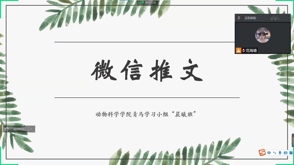 (通讯员:范海璐 李梦琪)为增强同学们的宣传能力,提高微信推文质量,1月16日晚7时,动物科学公司第二期青马学习小组在线上开展新媒体微信公众号推文培训,青马小组员工辅导员兼院团委员工会宣传部部长范海璐、邓翰源参与本次活动,并由范海璐担任主讲人。
