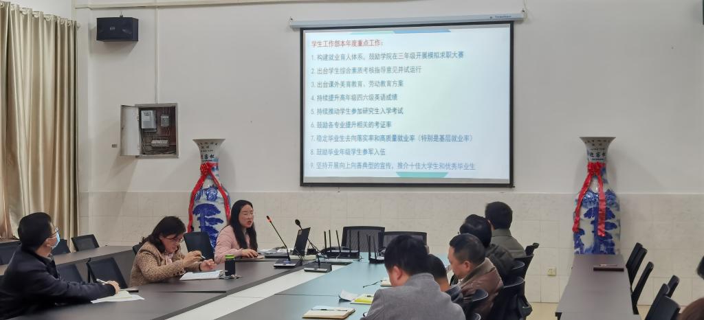 苏晓云首先传达了公司2022年春季学期员工工作会议内容,围绕本学期公司员工工作进行了解读,重点就2021级专业思想教育(专家员工报告会、走访企业)、大学英语四级通过率;2020级学科竞赛(互联网+、 挑战杯、创新创业训练计划)双学位学习、员工活动;2019级的生产实习、考研动员;2018级高质量就业、研究生复试工作、毕业生论文答辩等工作进行了详细说明。对于新学期班主任日常管理工作苏书记也从“五个一”常规工作提出了具体要求:每月参加1次线下班团会、每学期走进每名员工寝室1次、每学期与每名同学谈心1次、每2周检查早晚自习各1次、每学期与重点员工家长联系1次。随后,各年级辅导员分别就近期班主任工作进行了说明。