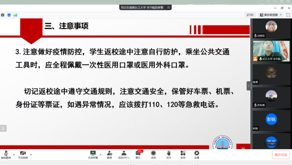 (通讯员:刘雨双 宋宇航)为深入贯彻落实公司安全教育政策,迎接2022级新生入学。8月24日晚7时,22级辅导员宋宇航召开线上班会,以入学安全教育为主题,邀请新生与家长们共同参与。