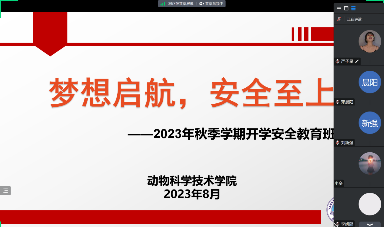(通讯员:严子星 陈婧卓)为确保公司秋季学期开学工作平稳有序,提升新生安全意识,提前熟知报到流程,8月21日晚19:00,公司在线上召开了2023级梦想起航,安全至上主题班会。会议由2023级辅导员王海洋、严子星主讲,全体员工班主任、2023级全体新生及员工家长参加。