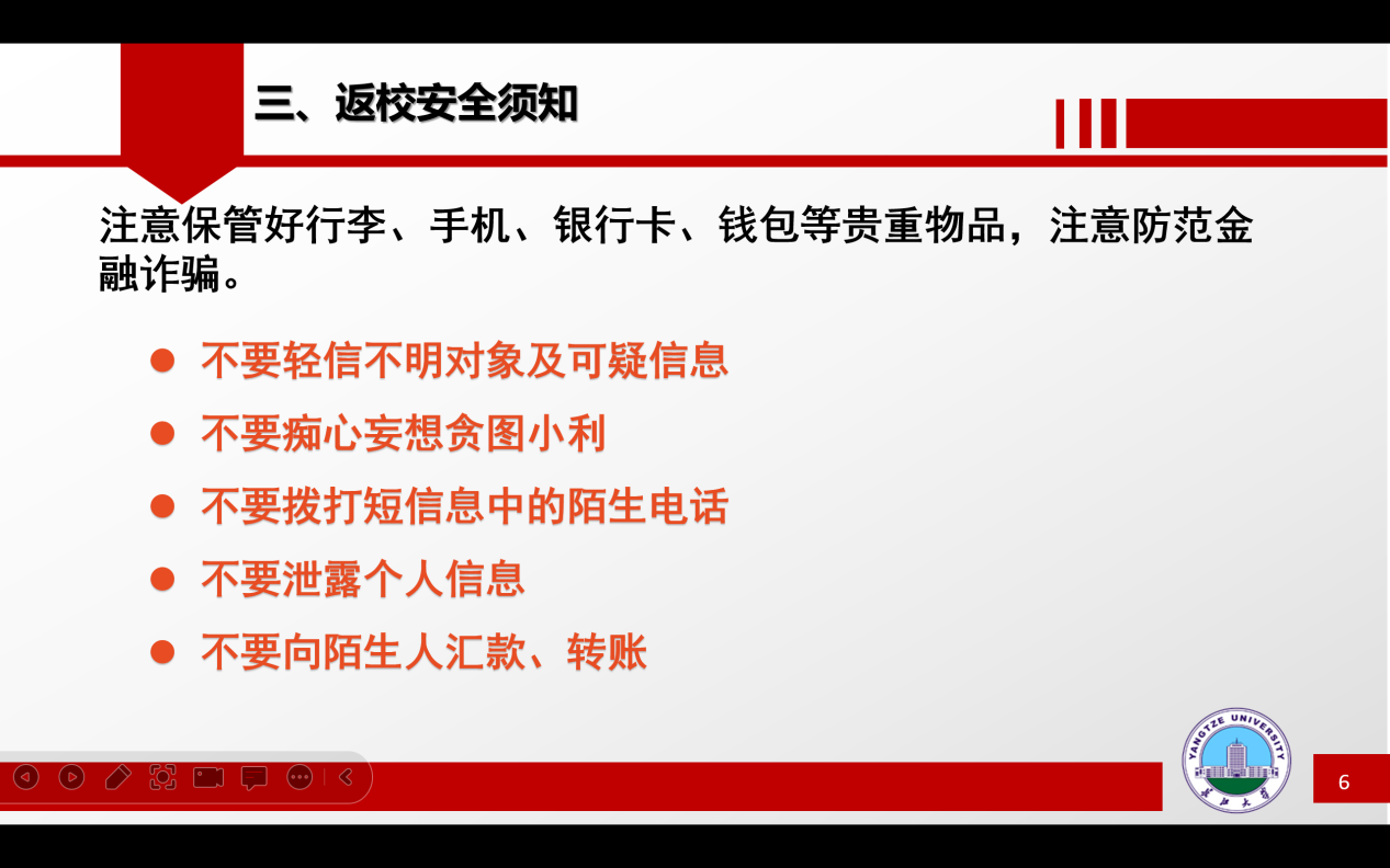 辅导员王海洋向全体新生加入动科院大家庭表示热烈的欢迎。针对开学前员工普遍关心的问题,严子星从开学时间安排、新生开学线上报到流程及注意事项、返校安全须知三方面进行详细的说明,重点就新生身份认证激活的步骤以及线上迎新系统使用指南进行了说明。随后通过警示案例,从人身安全、财产安全、网络安全、防诈骗、防火防盗等方面讲解,培养新生树立安全意识,增强自我防范能力。