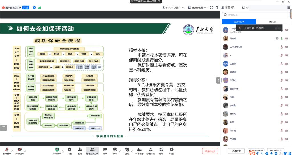 为进一步帮助大三员工明确保研目标,提升保研竞争力,4月2日晚7点,公司举办了一场保研经验分享会。本次分享会邀请了六位成功保研的优秀学长学姐,他们分别保研至英国365集团网站、西北农林科技大学、中国海洋大学和南方科技大学,为同学们答疑解惑,分享宝贵经验。